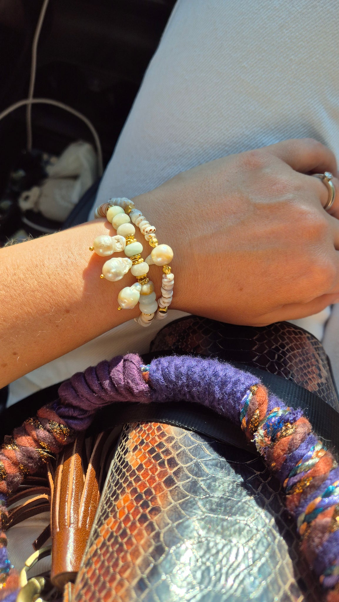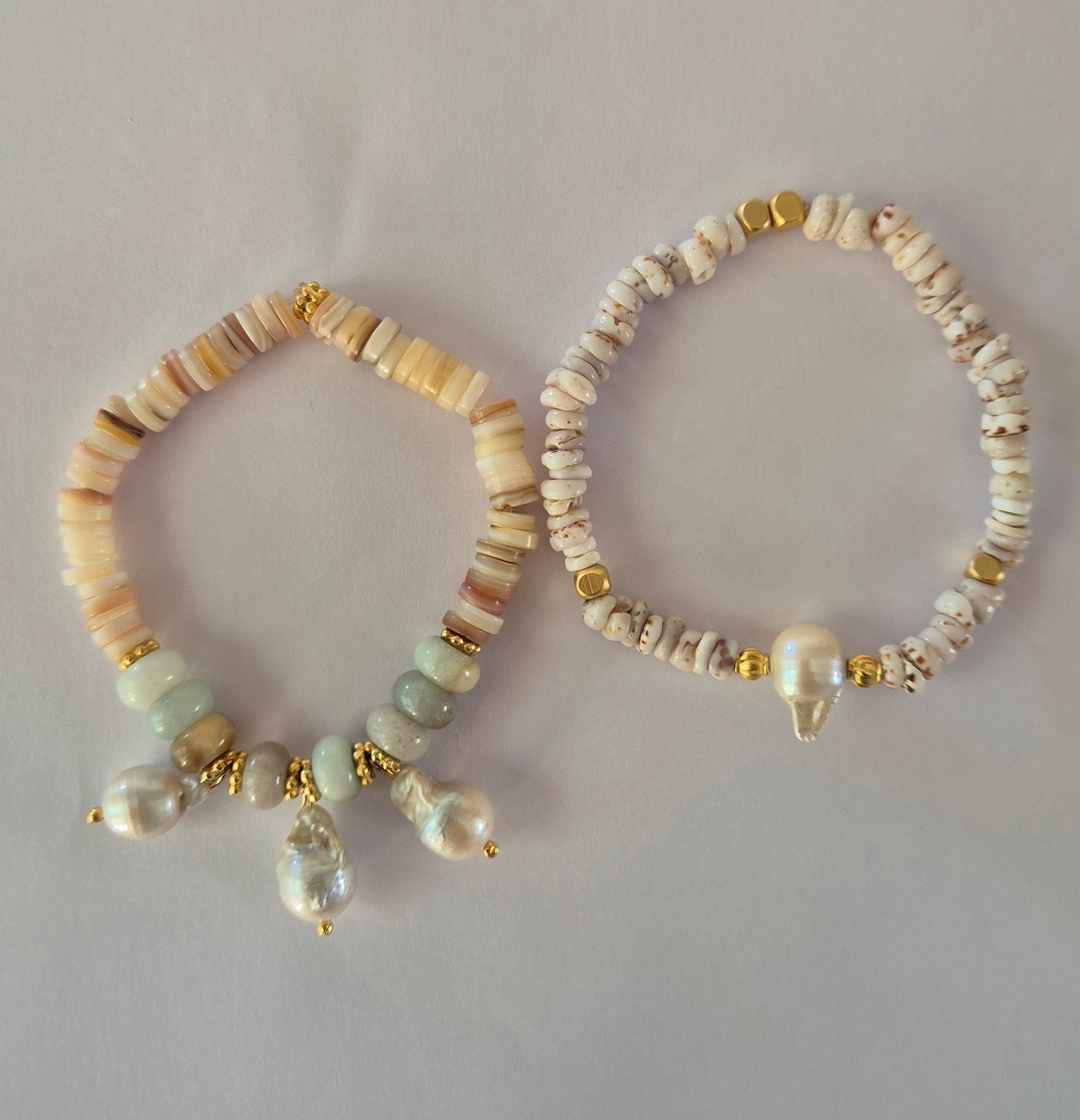 Duo de bracelets élastiques en coquillage, Amazonite et Perles d’eau douce.