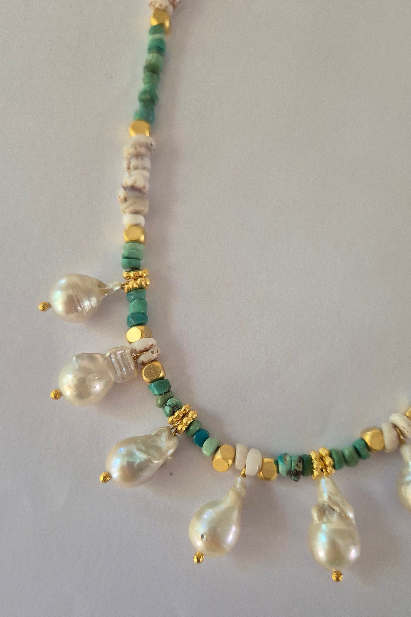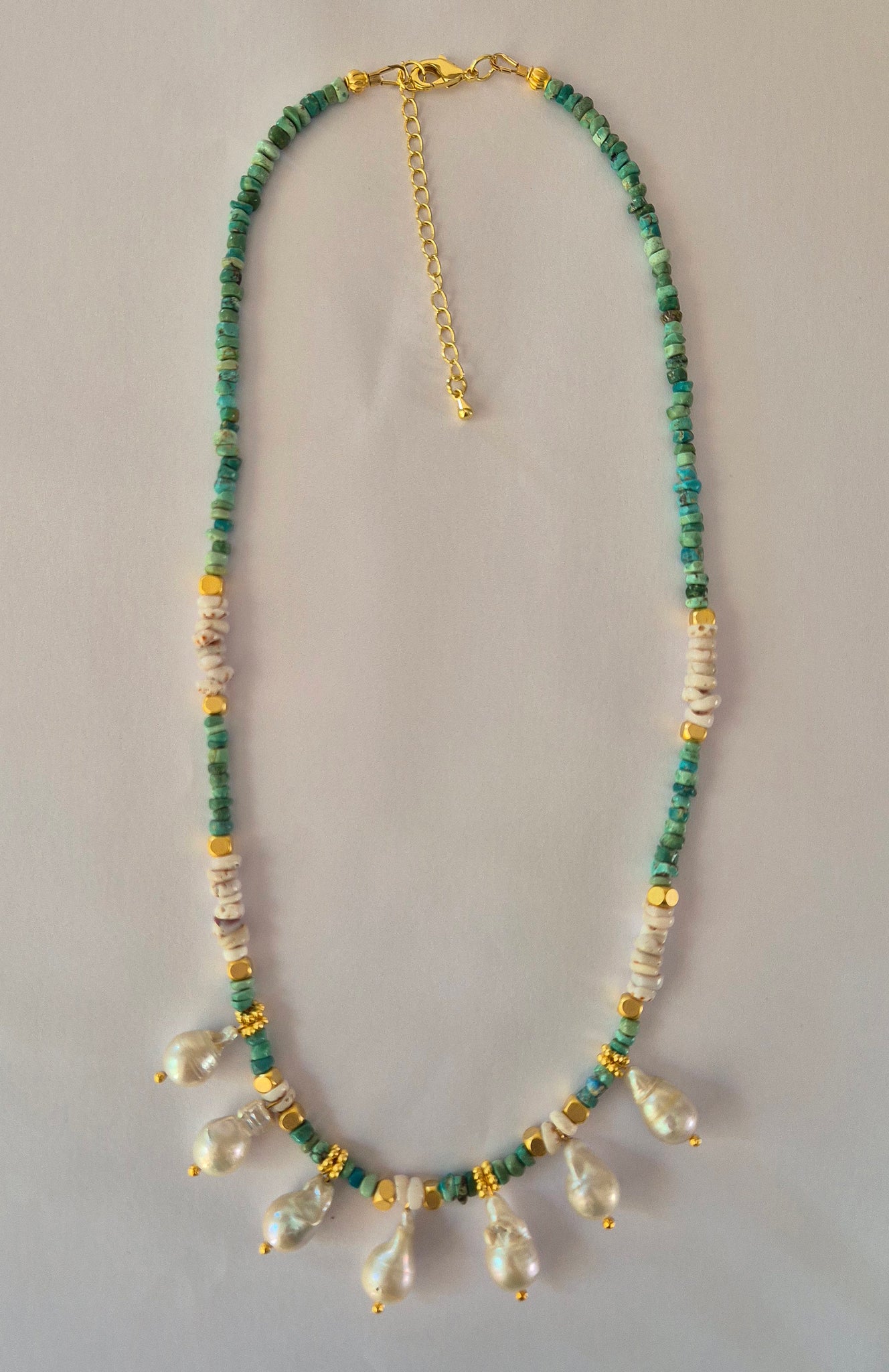 Composé de perles de coquillage et de perles de Turquoise d’Arizona. Perles intercalaires en laiton plaqué or 24k.