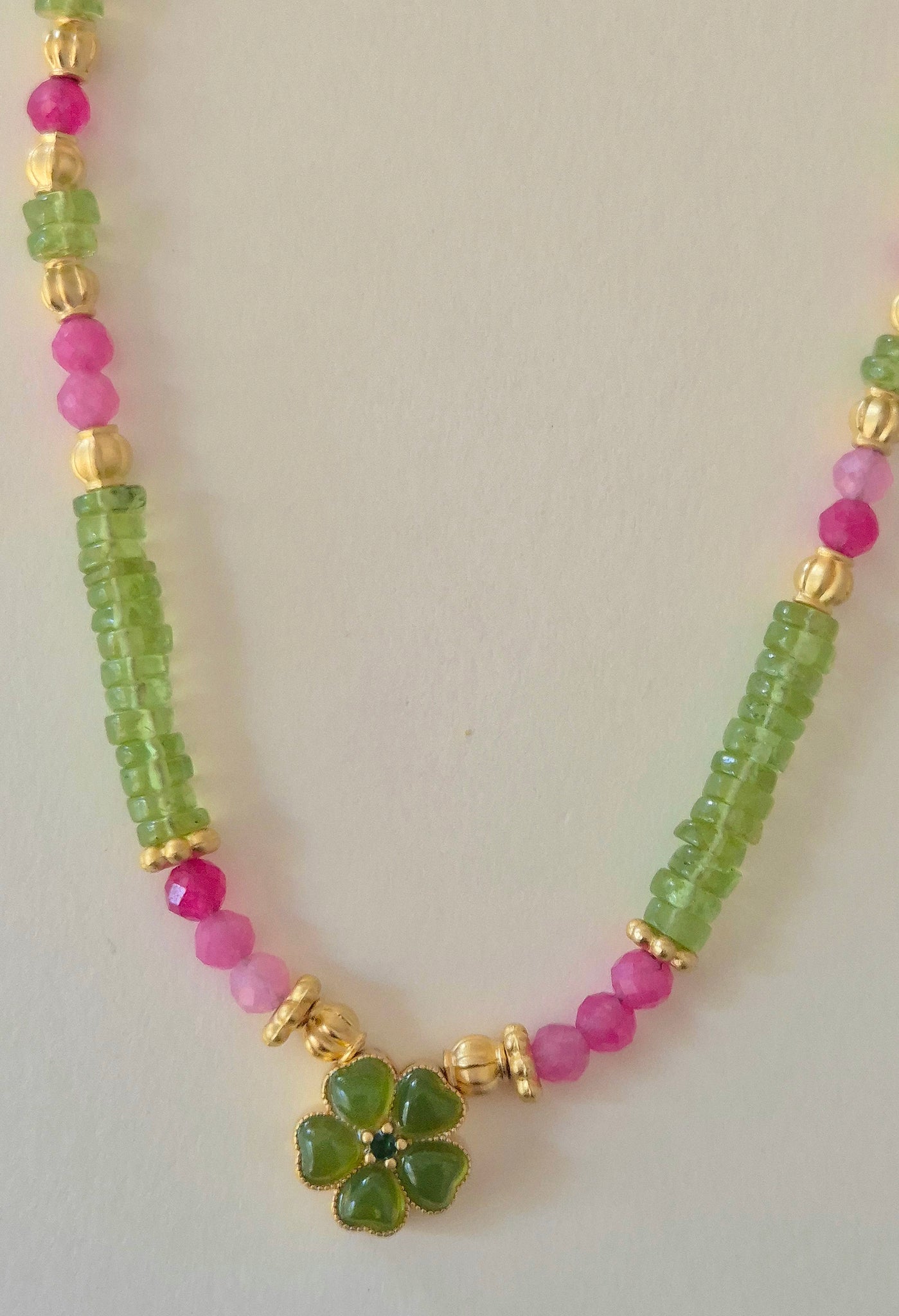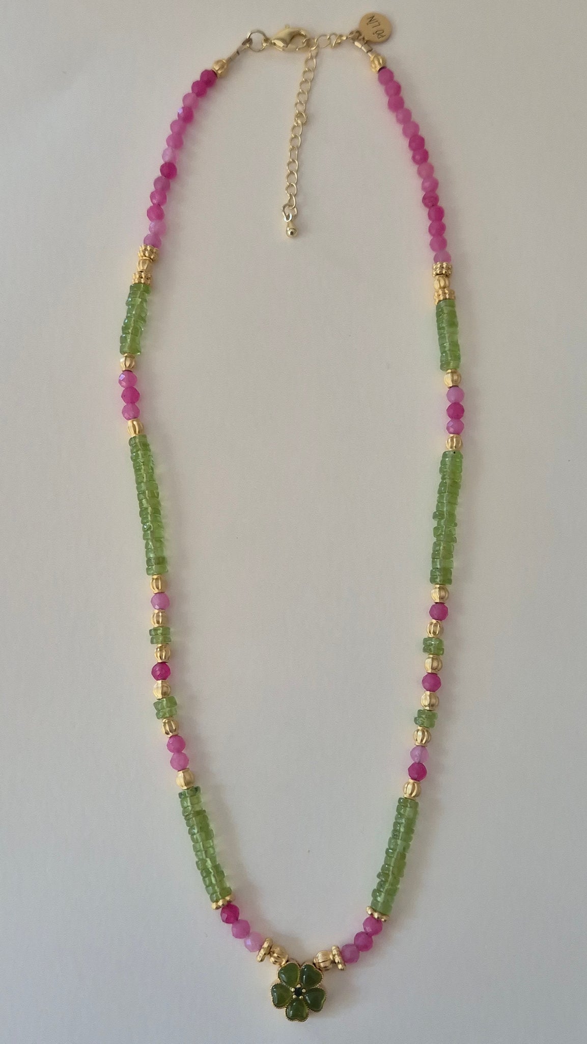 Composé de perles de Prehnite, de Rubis et perles en laiton plaqué or 24k