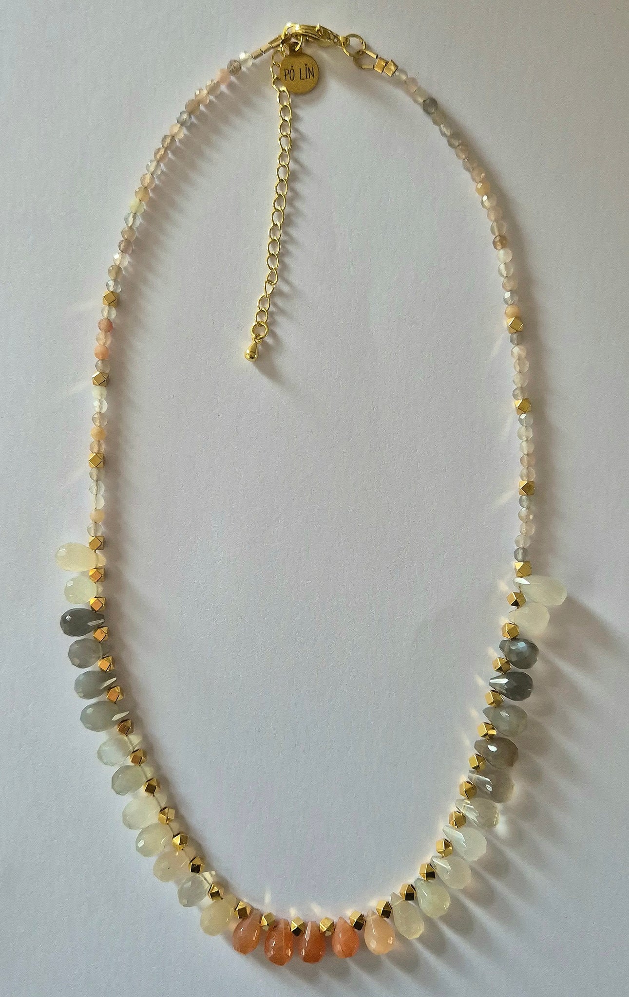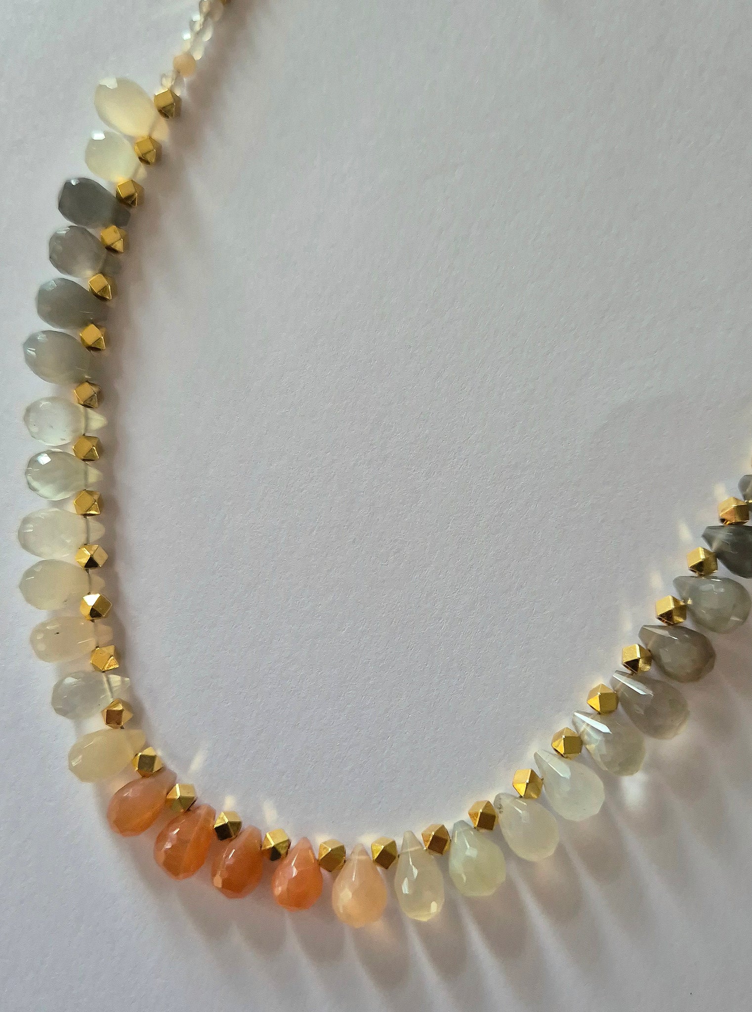 Composé de perles de Pierre de Lune et de perles intercalaires en laiton plaqué or 24k.