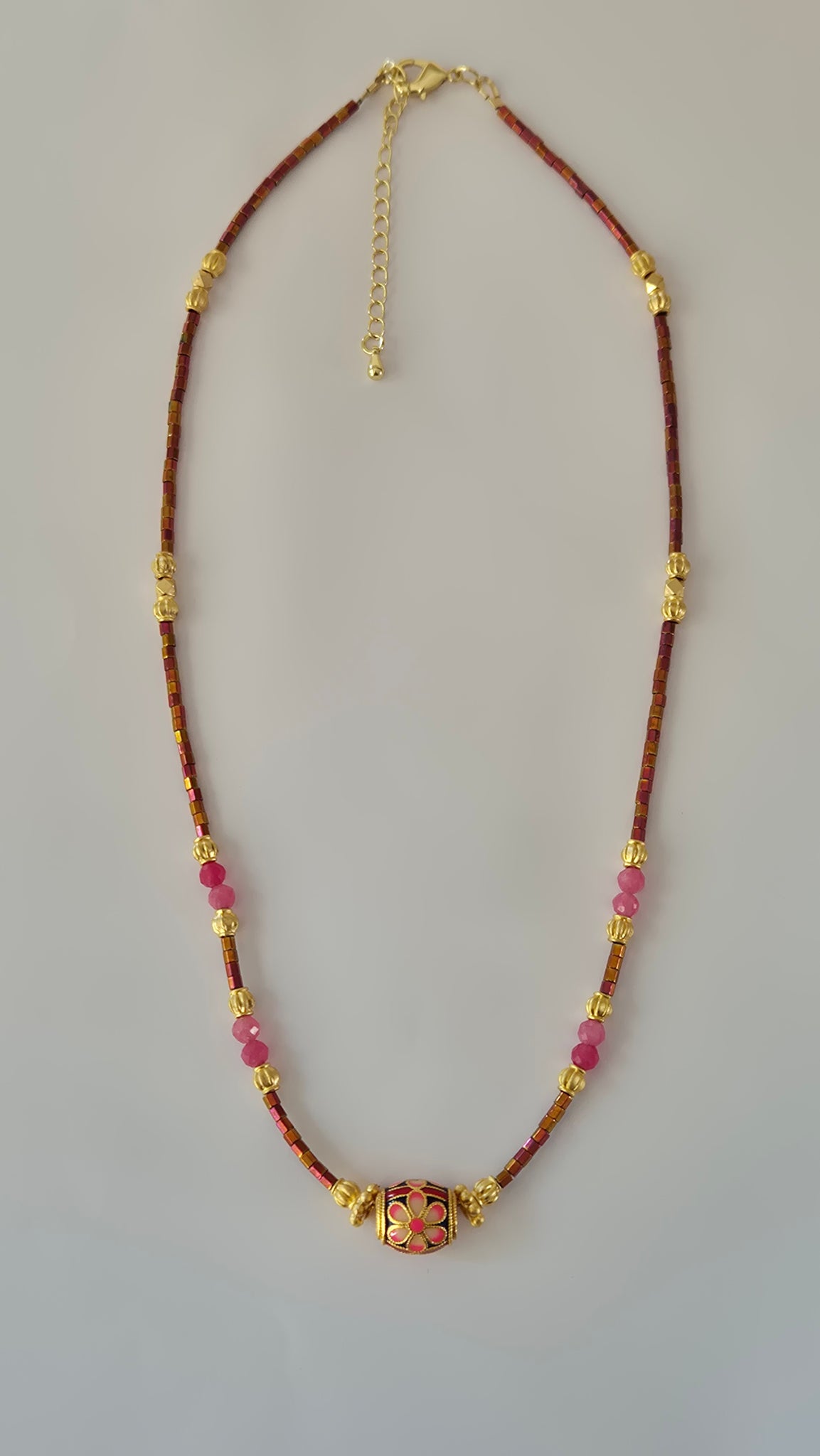 Composé de perles en Hematites, Rubis et laiton plaqué or 24k.