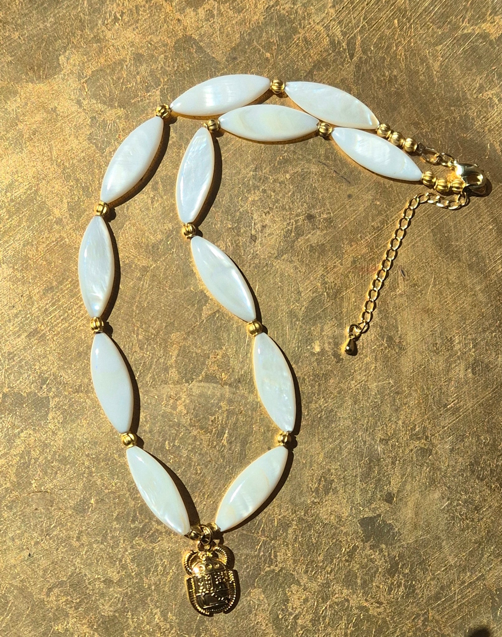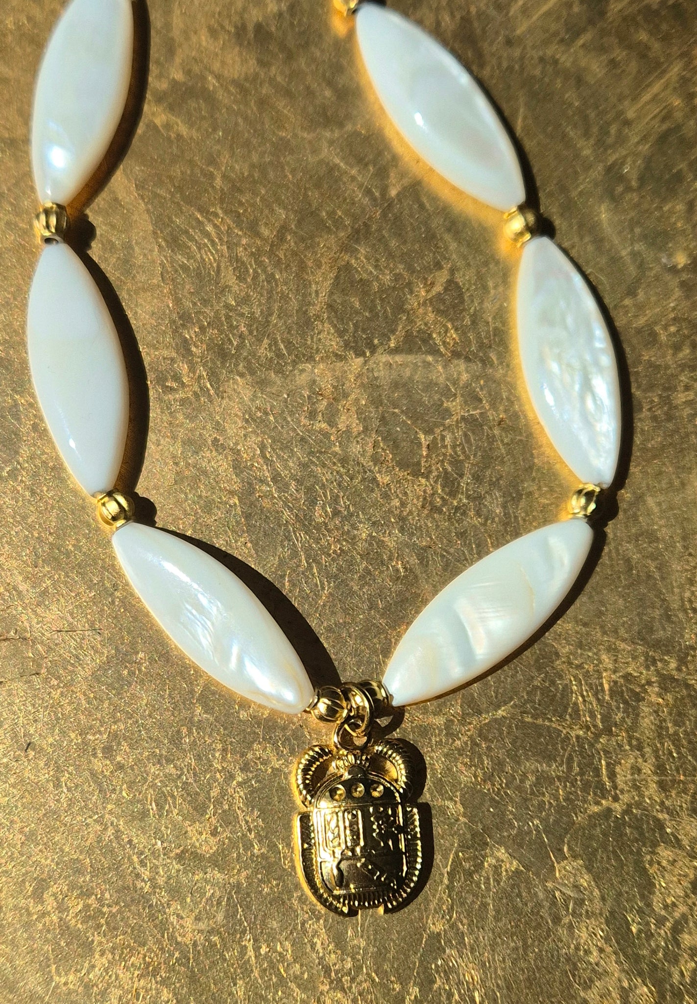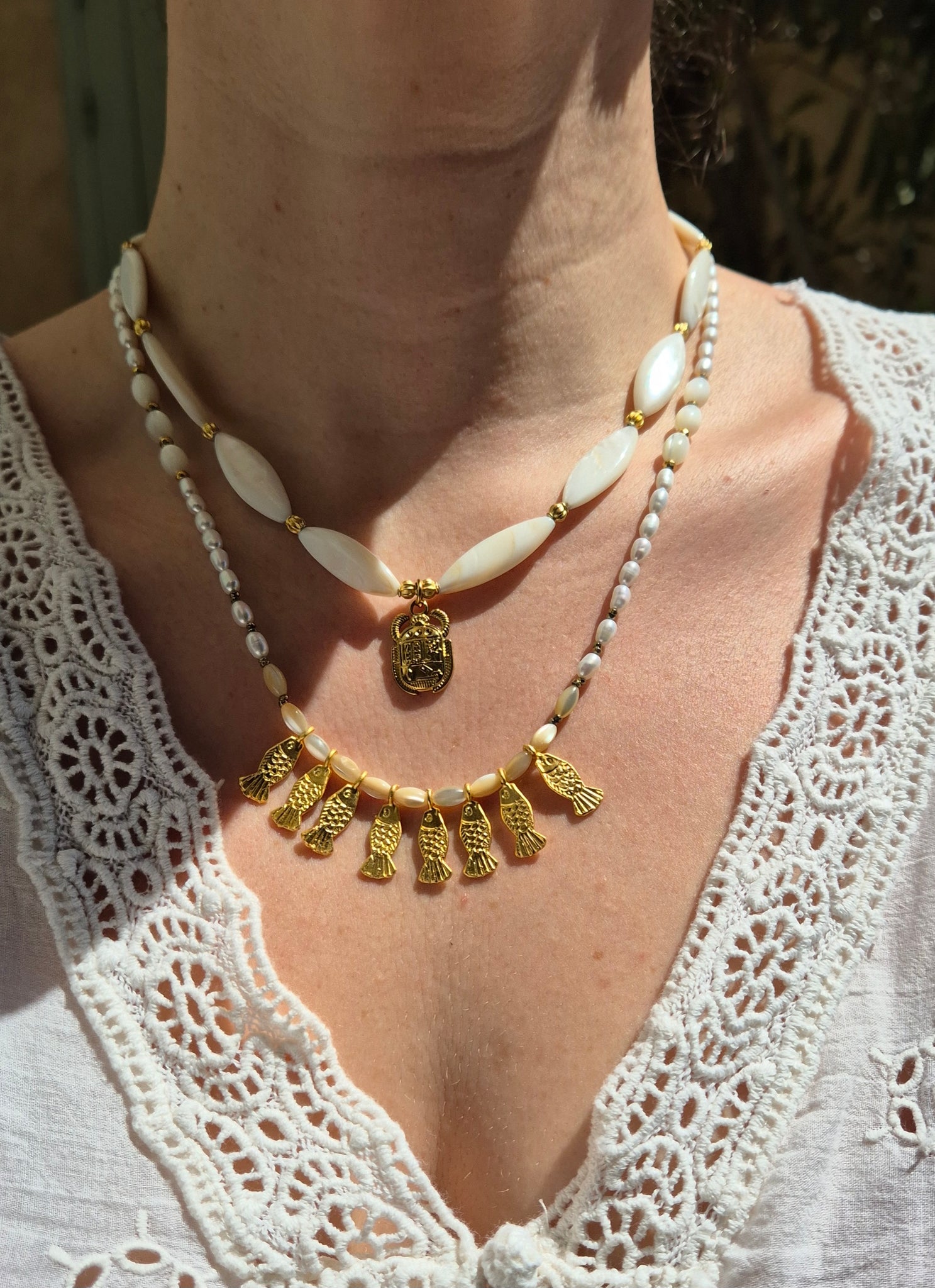 Composé de perles de Nacre et de perles en laiton plaqué or 24k.