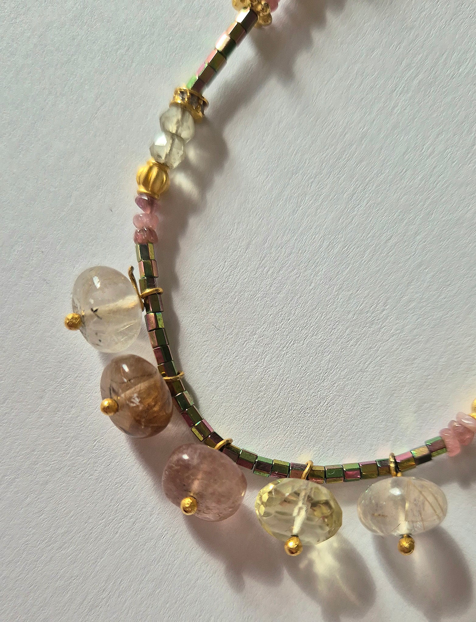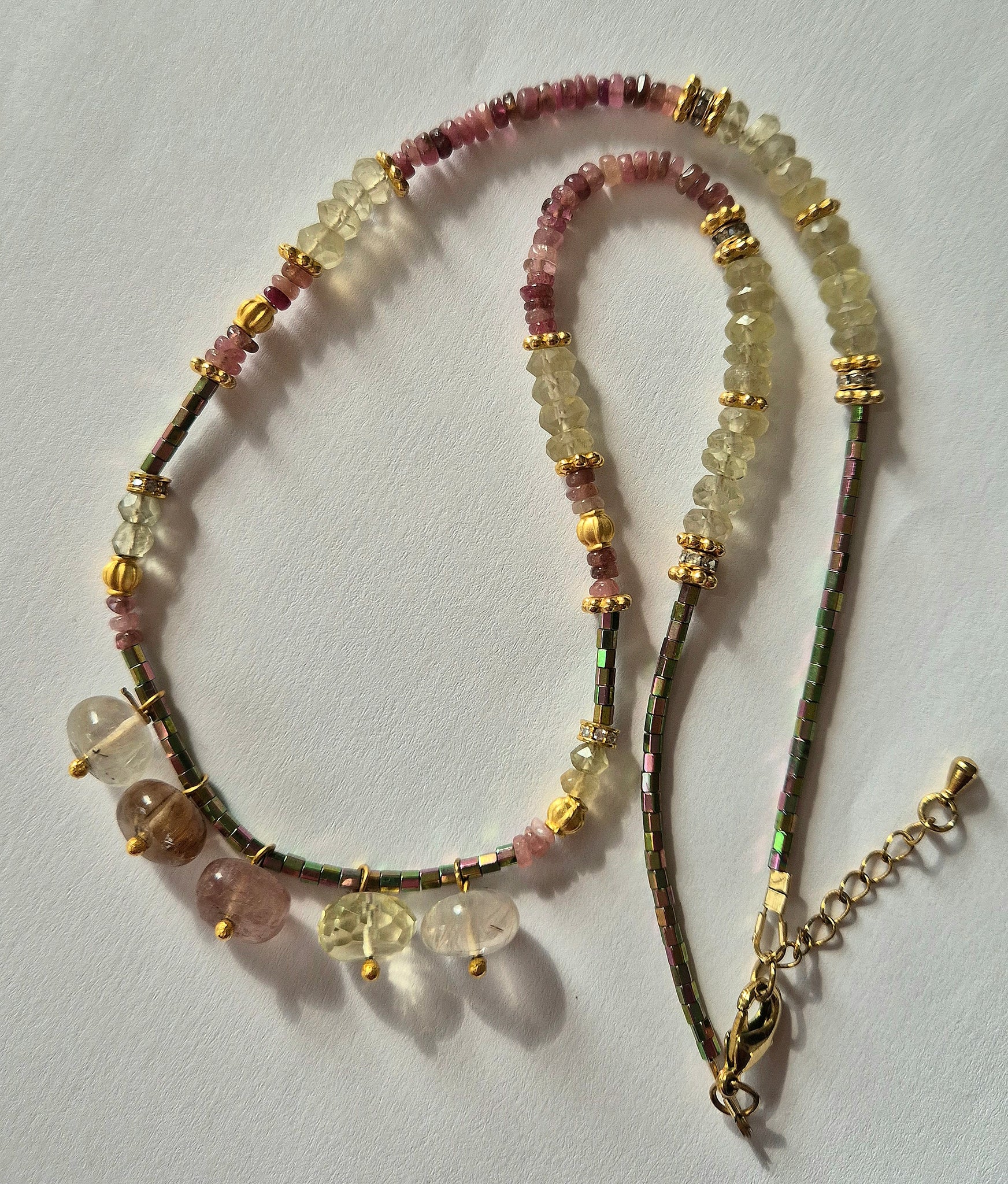 Collier composé de perles de Quartz (Citron, Rutile, Fraise), de perles de Tourmaline Rose et d’Hematite.